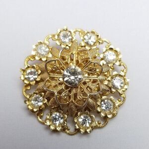 Vintage Rhinestone and Gold Tone Filigree Round Brooch, Floral Radiant Shape