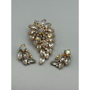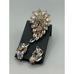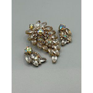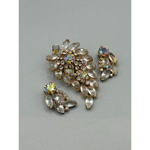 Vintage Rhinestones Brooch & Clip On Earrings Set Clear Stones AB Stones Finish