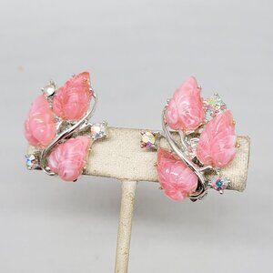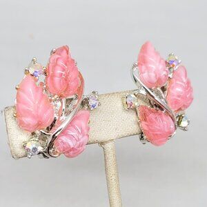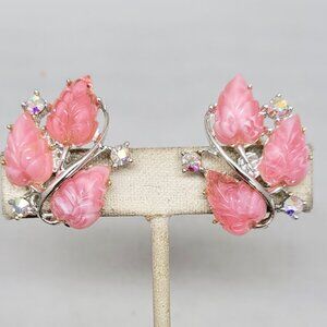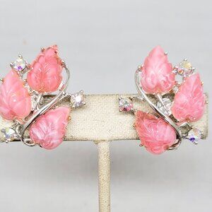 Vintage Rhodium Plated Pink Tutti Frutti Leaf & Aurora Borealis Clip Earrings