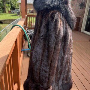 Step out in old school style when you wear this gorgeous chocolate brown mink with black fox fur trim on the collar, cuffs and bottom.
