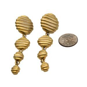 Vintage Ribbed Design Earrings Drop Flattened Dome Bead Textured Gold Tone Vtg