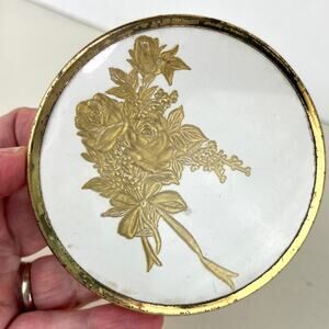 Round satin glass vanity jar with metal lid adorned with gold rose bouquet. Measure approx 4" round