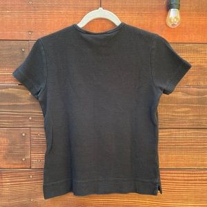 Vintage, ribbed Liz Claiborne top with short-sleeves and split V in neckline as pictured. Fabric is thick, 100% cotton. Small slits in the hem on either side. Has some natural wear as pictured due to preloved nature. Great elevated basic that would look great with a pair of jeans. It also has a sweater-like feel that can be dressed up for business casual. Size S.