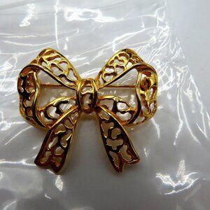 This vintage gold-tone bow pin brooch adds a touch of elegance to any outfit. Its intricate design and secure clasp make it a versatile accessory. Preowned