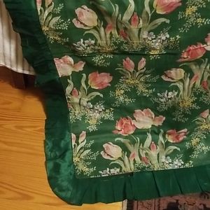 Multiple different ribbon colors, Green taffeta around 3 edges, pink with green tulips on back of quilt. Some small pulls in ribbons as you would expect from an vintage quilt. Age unknown. Non smoking home.