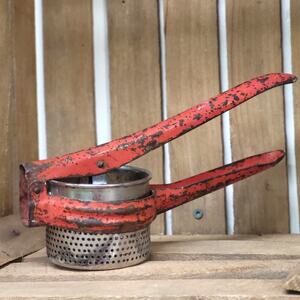 This 1950's red potato ricer is a great accent for a farmhouse kitchen.