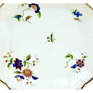 The dish is white bone china with a basket weave pattern embossed along the inner rim and the beautiful hand painted design features red, purple, green and gold flowers as well as gold trim around the scalloped top edge. The tray measures (approximately) 6 inches across and 1.25 high.