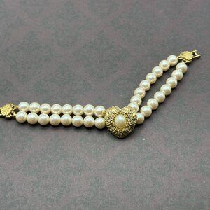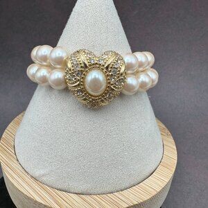 Vintage Richelieu Double Faux Pearl Bracelet with heart “centerpiece” covered in