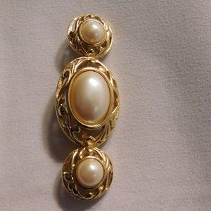 Vintage Richelieu Faux Pearl Brooch Pin. Gold-tone metal. Pretty with 3 faux pearls and stamped Richelieu on the back.