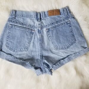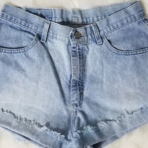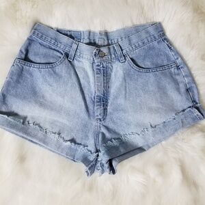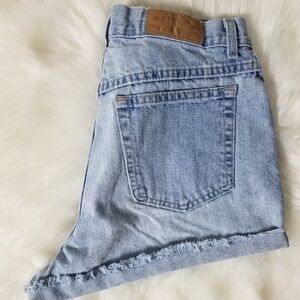 Riders light wash cutoff denim shorts. Size tag attached but not readable. Perfect to wear cuffed or uncuffed. Raw, frayed hem. Lightly distressed.