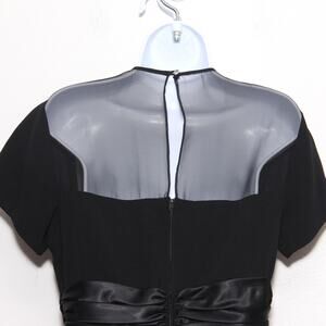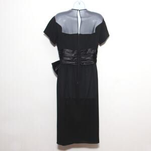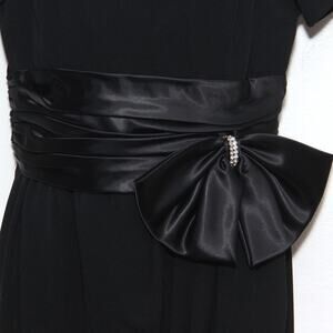 Vintage Black Cocktail Dress Rimini Saks 5th Avenue Size 10. Union made ILGWU. Made in USA. Sheer neckline. Ruched satin waistband with large bow with rhinestone accents. Skirt is pleated in front which creates attractive draped effect in the fixed wrap style skirt.
