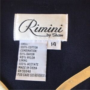 Vintage, Rimini by Shaw, form fitting blazer jacket. Navy blue with gold trim. Oversized gold buttons. Front cutout detail with scalloped hemline. Front hidden snap closure. Shoulder pads. Size 14. See photos for measurements to ensure fit.