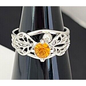 Vintage Ring Silver Tone Prong Set Orange Crystal Rhinestone MCM Costume 4K