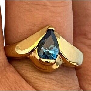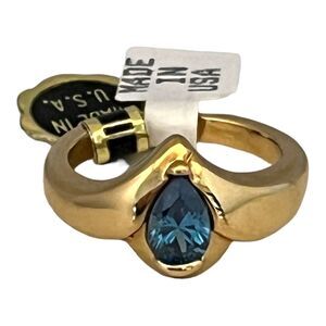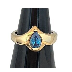 Gorgeous gold plated ring featuring a blue cubic zirconia.