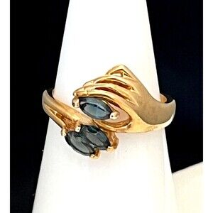 Vintage Ring Victorian Style Hand Holding Blue Crystals 14K Yellow Gold Electroplate