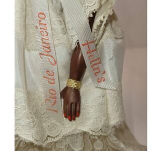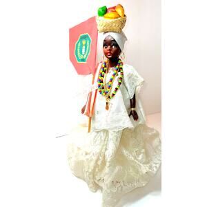 This vintage Helln's doll from Rio de Janeiro is a delightful find! She's dressed in traditional attire and features a fun fruit hat, a beaded necklace, and a miniature flag. A unique souvenir to add to your collection or a charming piece of decor. She is in good condition. Don't miss out on this precious piece of Brazilian culture!