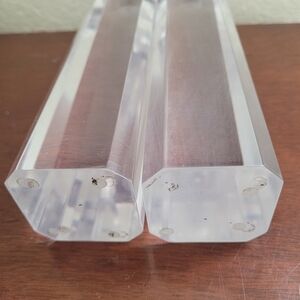 Vintage Ritts Astrolite Lucite Arcylic Candle Holders Mid Century Modern Set of 2 HOLLYWOOD REGENCY. A gorgeous SET of solid lucite candle holders by Ritts Co. Of L.A. Each feature beveled edges with removable silver plate cups for easy polishing. Approximate Measurements: 10.5" x 2.25" x 2.25"