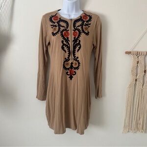 Vintage Ritu Kumar Tan Women’s Long Sleeve Dress with Red and Black Embroidered Boho Size 4