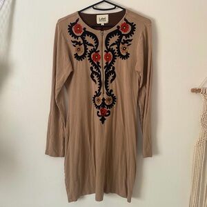 Chic long sleeve dress by Ritu Kumar. Features elegant red and black embroidery on a tan base. Perfect for stylish occasions.