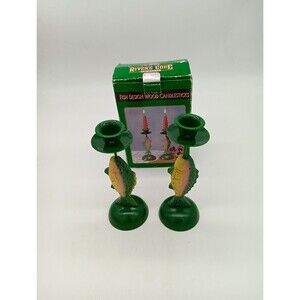 Vintage Rivers Edge Wooden Hand Painted Fish Design Candlesticks NOB