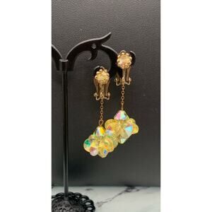 These Vintage Rivoli Crystal Clip On Earrings are a stunning piece of mid-century glam jewelry. The shape and yellow crystal main stones add a touch of retro elegance. These earrings are perfect for special occasions like weddings, anniversaries, and birthdays, and will surely make a statement with their chandelier style and excellent cut grade. Made in the United States in the 1960s, these earrings have a vintage charm that will appeal to those who love timeless beauty and classic fashion.