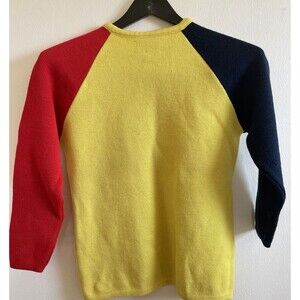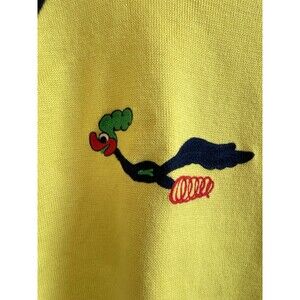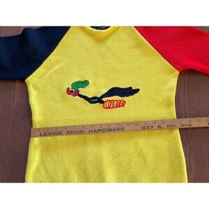 Excellent pre-owned condition. Rare find! Yellow sweater with red and blue sleeves, with a chain stitched Roadrunner.