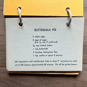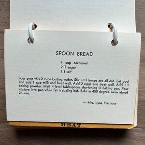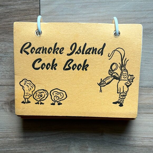 Vintage Roanoke Island 2-ring flip cookbook. The inscription says, "The recipes in this little book were collected by members and friends of the Manteo Woman's Club, Manteo, N.C." The recipes are printed on 3.5" x 5" index card-sized stock and include the following categories: Bread, Meat, Vegetables, Desserts, Sauces and Dressings, and Miscellaneous. This collection includes such classics as Clam Fritters, Shrimp Fondue, Eggplant Surprise, Buttermilk Pie, Carolinian Tipsy Cake, Lemon Chiffon Pie, Whiskey Balls, and Hot Mexican Bean Dip. The name of the "donor" of each recipe is printed at the bottom of the card. Very cute little community cookbook in good vintage condition!