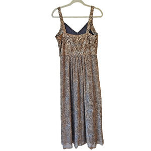The Vintage Robbie Bee Y2K 90s Leopard Print Babydoll Maxi Dress in size 10 offers a boho chic style that is perfect for various occasions such as weddings, parties, or casual wear. Made of chiffon fabric with a lightweight feel, this long dress features a V-neckline, zip closure, and strappy sleeves. The animal print pattern in brown is a nod to the 90s retro theme, giving off a hipster and bohemian vibe. Easy to care for with machine washable instructions, this dress embodies the indie and free-spirited fashion trends of its era.