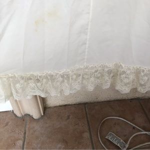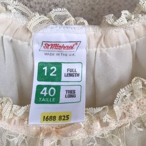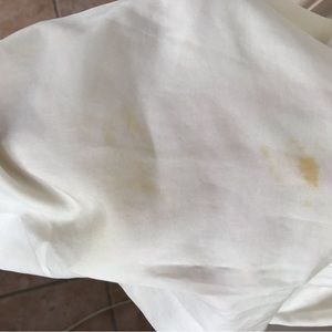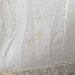 Late 80s/ early 90s. Slightly see through. Two spots with stains - bottom left and back left side - as seen in photos. Color is like creamish/ off white. Does not indicate size, but it’s fits a small.