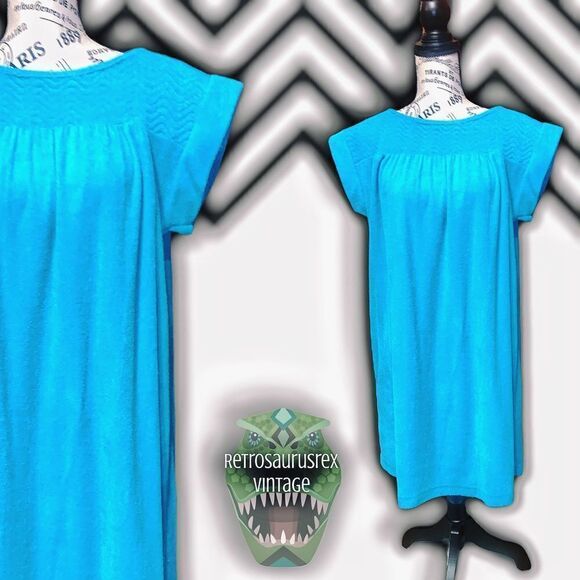 Retrosaurusrex Vintage; vtg peignoir; beach; bath; shower; nightgown; nightie; loungewear; comfy; comfortable;cute; kidcore; vacation; resort wear; funky; pin up; rockabilly; Marilyn Monroe; Audrey Hepburn; retro; Vintage 1970’s Twee Turquoise Terry Cloth Robe Coverup Bath Dress, Large; towel dress