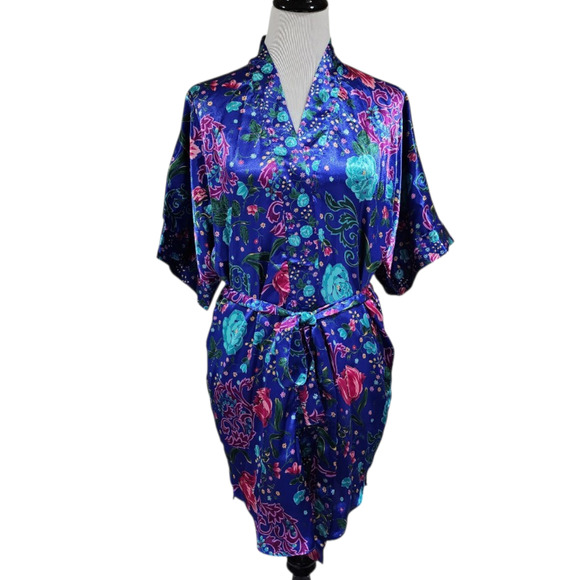Vintage Robe Satin Floral Vibrant Jewel Tone Belted Size M