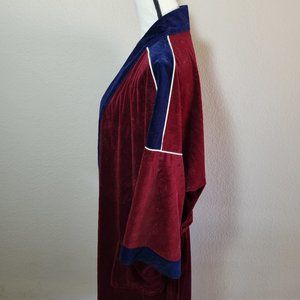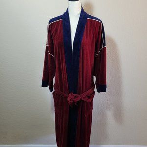 This mens vintage robe is so nice, you won't want to take it off. Maroon velvet like material with blue navy and white accents. Shoulder to bottom is approx 48"