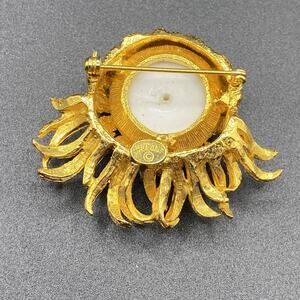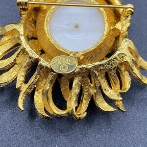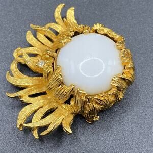 The product is a rare vintage Robert Demario signed milk glass cabochon sea anemone brooch pin. This fashion jewelry piece features a white glass cabochon as the main stone, set in a gold-colored glass material. The design of the brooch is inspired by beauty, art, beach themes, sea life, and retro fashion, making it a unique and eye-catching accessory for women. The originality of the piece adds to its value and appeal for collectors of vintage and antique jewelry.