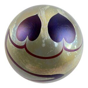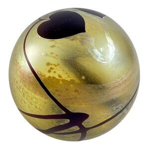 This captivating hand-blown glass paperweight is a signed original piece by renowned American glass artist Robert Eickholt. Dated 1984, this vintage piece features a unique, iridescent gold/champagne exterior that shimmers with an oily rainbow effect.