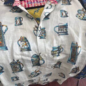 Turn heads with this bold statement piece from Robert Graham. This button-up shirt blends classic artistry with modern flair, featuring a striking stein-and-tankard print on a cream background contrasted by deep navy floral sleeves. The interior collar pops with vibrant pink and white patterns—Robert Graham’s signature touch of hidden personality.