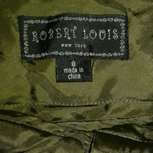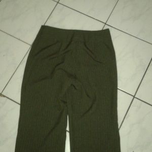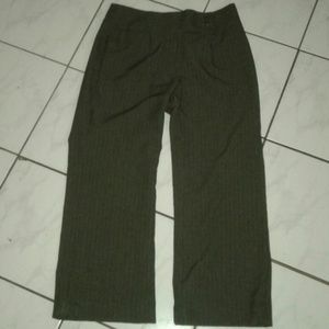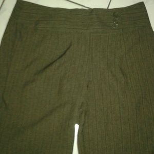 Really nice dark khaki color with pinstripes size 8 pants. They are pretty and up top in front they zip shut and have material that folds over and has 3 buttons in a row there nice decorativepant style. Its has no pockets in the back. They are stylish and sleek.