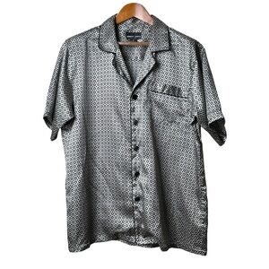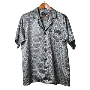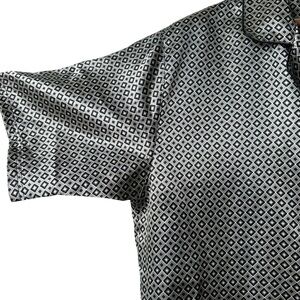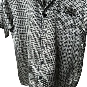 Gray silk and poly blend button up sleep shirt with black and white diamond pattern. Black buttons. Chest pocket. Super soft and smooth fabric. Can be worn during the day as a layering piece - looks great with jeans. Super 90s R&B video vibes!