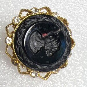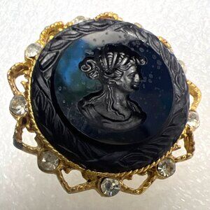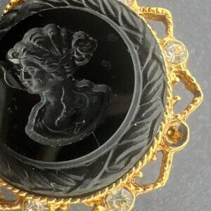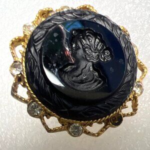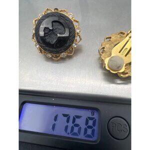 Vintage Robert Rose Cameo Clip-On Earrings Black Goldtone Filigree Rhinestone SE