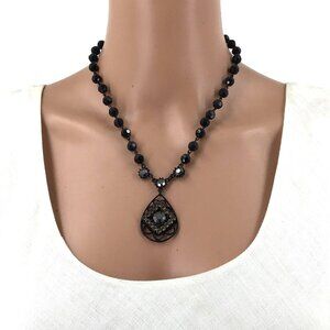 Vintage Robert Rose Necklace Black Beaded Rhinestone Pendant Adjustable Length