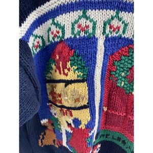 Get into the holiday spirit with this vintage Robert Scott Christmas sweater. The blue cotton material is perfect for a casual occasion, and the crew neck design adds a touch of sophistication. The sweater features a fun and festive Christmas look with a sled tree wreath, making it a great addition to your vintage clothing collection. This sweater is a women's size medium and was made in Hong Kong. Add it to your wardrobe today and enjoy the holiday season in style!