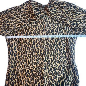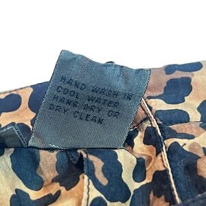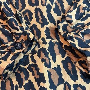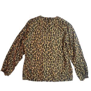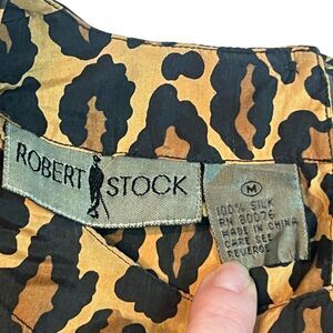 This is a vintage Robert Stock blouse for women in size Medium, featuring an all-over leopard print on silk fabric. The blouse has long sleeves with a classic/fitted sleeve type, a round neckline, and a button closure. It is suitable for various occasions such as parties, casual outings, or business settings. The blouse has a classic fit and is recommended for hand wash only. Missing a button on the sleeve please review the photos.