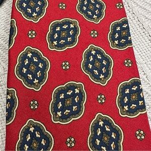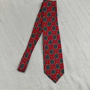Vintage 100% silk Robert Talbott for Roderick St. John's necktie. Red with a blue/green oval design.