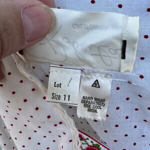 Vintage Roberta California 60s 70s Boho Hippie Peasant Dress Women's. Gorgeous dress done in white cotton with tiny red polka dots. long sleeves that are fitted at the top and flared at the hem, lace-up bodice, rose print trim, fitted waist with tie back sash, and flowy maxi length with subtle tiered hem. Zipper closure in the back, fully lined. In good preowned condition. Tag says size 11, but keep in mind that vintage sizes are smaller then modern ones. So please see measurements below for a proper fit, as its more of a small. Measurements are approximate taken flat.