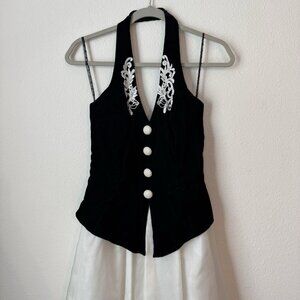 Features a black halter velvet bodice with white lace overlay with sequin detail. White pearl buttons.