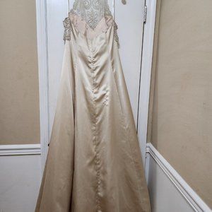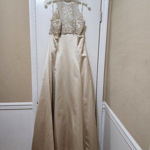 Beautiful Champagne colored dress with floral sequin and lace mesh on chest, open back, floor length dress. Worn only once at prom in 1998. In great condition!