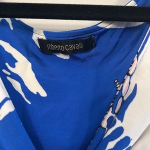 Vintage Roberto Cavalli Blue and White Stretch Jersey Dress. Made in Italy. Authentic. Excellent condition. Rayon and spandex. Opening at chest. Gold and rhinestone hardware. Beautiful on and has a lot of give.