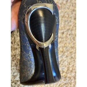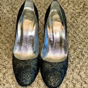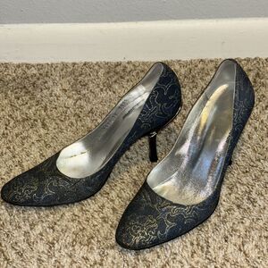 Unique Robert Cavalli vintage denim and gold pump with metal RC monogram heel size 38.