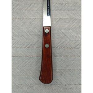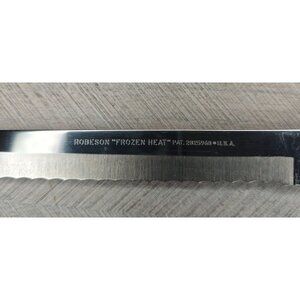 The Robeson "Frozen Heat" knife combines classic design with functionality. Its serrated blade makes slicing effortless, while the wooden handle provides a comfortable grip. This vintage piece is ideal for culinary professionals seeking reliable tools.