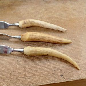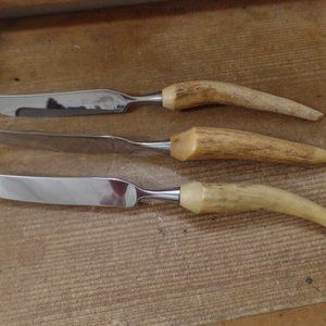this is a set of 3 stag handle knives,i will say butter knives but they do seem to have a slight edge ,the blades are about 3.5 inches long and over all they are about 8.5 inches long,all are in great condition ,one blade has a couple of slight dings on the edge as seen in my last photo,so slight i had a hard time capturing it,,they are all marked "Robeson Germany Stainless
