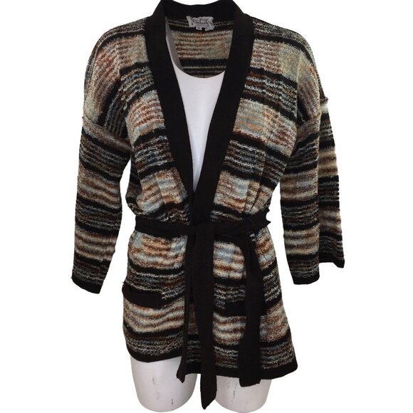 Vintage Rochelle Womens Cardigan Wrap Sweater Brown Striped Cream Blue Size XL
